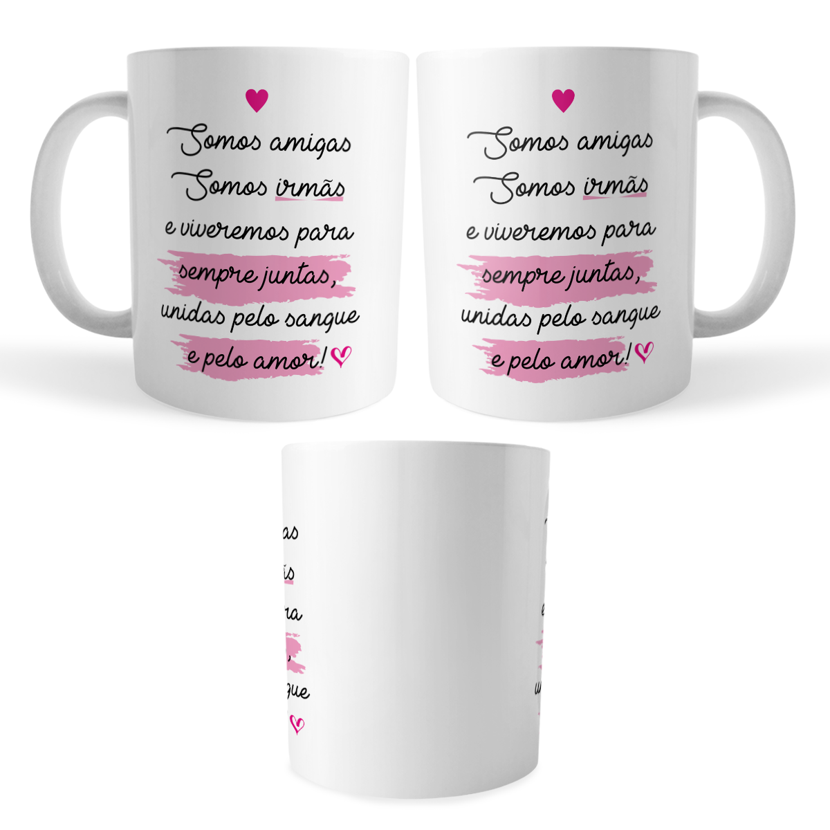 Comemore laços de sangue e de coração com esta caneca xicara especial para amigas e irmãs! A frase “Somos amigas, somos irmãs e viveremos para sempre juntas, unidas pelo sangue e pelo amor!” transmite carinho, gratidão e cumplicidade em cada detalhe. Arte pronta delicada em rosa, perfeita para presentear no aniversário, Dia da Amizade, Dia das Irmãs ou simplesmente para lembrá-la do quanto é importante.