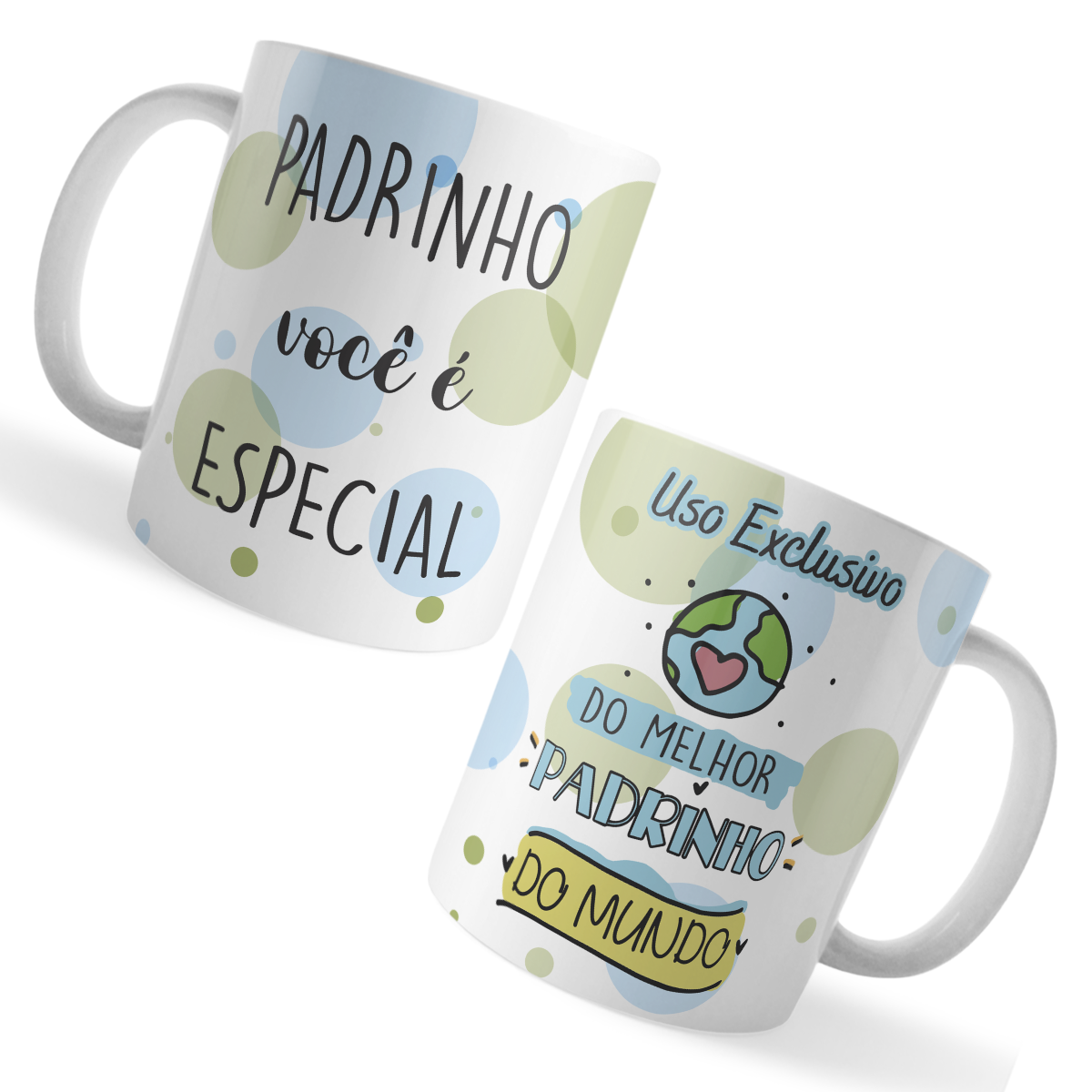 Caneca com frases “Padrinho, você é especial” e “Uso exclusivo do melhor padrinho do mundo”, estampa colorida e cheia de significado.