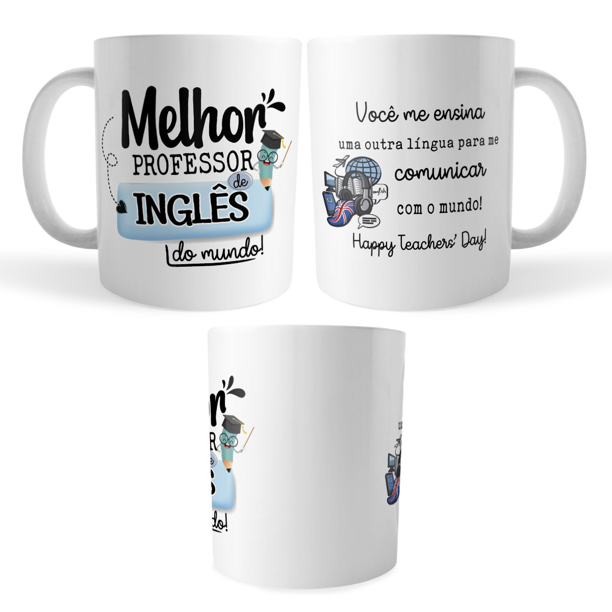 Estampa: “Melhor Professor de Inglês do mundo!” e mensagem sobre se comunicar com o mundo