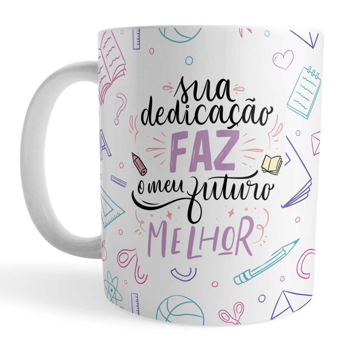 Demonstre toda sua gratidão àquela professora especial com esta caneca cheia de carinho: “Sua dedicação faz meu futuro melhor. Professora Gratidão”. Arte pronta, colorida e repleta de elementos escolares, perfeita para presentear quem faz a diferença na escola e na vida dos alunos. Uma lembrança afetiva para o Dia dos Professores, aniversários ou qualquer ocasião em que reconhecimento, gratidão e respeito devem ser celebrados.